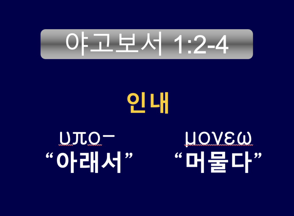아래(hypo)’와 ‘머물다(meno)’의 합성어로, 무거운 압박감이나 시련 아래에서도 도망치지 않고 그 자리를 견고하게 지켜내는 **’능동적인 버팀’**을 뜻합니다.여기의 인내란 무너지지 않고 계속 하나님을 신뢰하는 지속적인 믿음을 말합니다. 도망가지 않고 끝까지 버티는 것입니다.