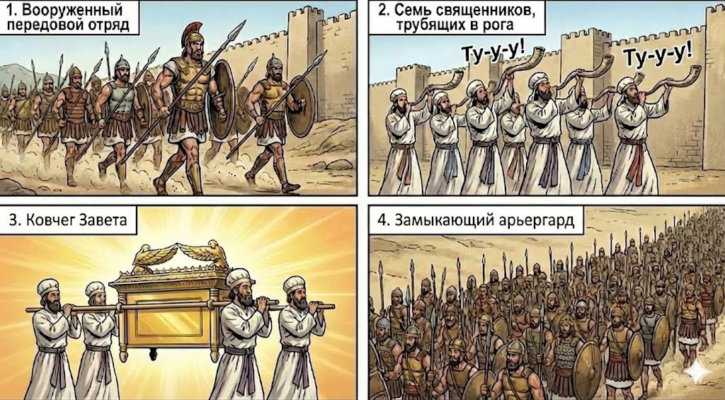 오늘 본문 여호수아 6장을 보십시오. 하나님이 제시하신 ‘여리고 돌파 전략’은 세상의 군사학으로는 도저히 이해할 수 없는 방식입니다. 이것은 전쟁이 아니라, 마치 거대한 ‘예배 의식’과도 같습니다. 그 행진의 대형을 주목해 보십시오.